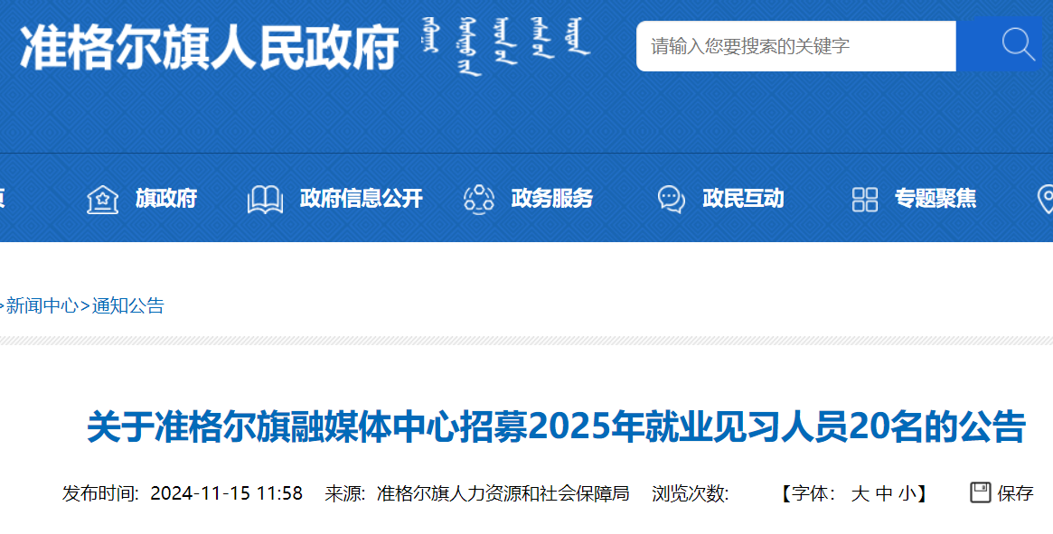 小編根據(jù)準(zhǔn)格爾旗人民政府發(fā)布”關(guān)于準(zhǔn)格爾旗融媒體中心招募2025年就業(yè)見習(xí)人員20名的公告“得知,2025年內(nèi)蒙古鄂爾多斯準(zhǔn)格爾旗融媒體中心招募就業(yè)見習(xí)人員20名,報(bào)名時(shí)間為2024年11月15日-12月15日。