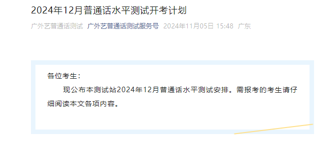 現(xiàn)公布本測試站2024年12月普通話水平測試安排。需報考的考生請仔細閱讀本文各項內容。