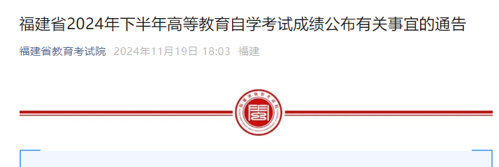從福建省教育考試院了解到,福建省2024年下半年高等教育自學考試成績公布有關(guān)事宜的通告已公布,具體如下: