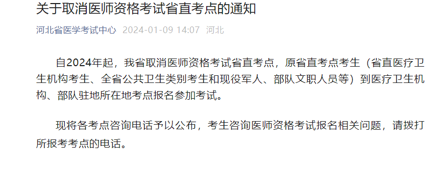 自2024年起,河北執(zhí)業(yè)醫(yī)師考試取消省直考點(diǎn),原省直考點(diǎn)考生(省直醫(yī)療衛(wèi)生機(jī)構(gòu)考生、全省公共衛(wèi)生類別考生和現(xiàn)役軍人、部隊(duì)文職人員等)到醫(yī)療衛(wèi)生機(jī)構(gòu)、部隊(duì)駐地所在地考點(diǎn)報名參加考試。