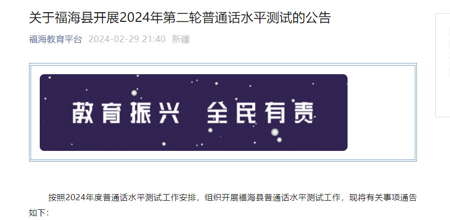 按照2024年度普通話水平測試工作安排,組織開展福海縣普通話水平測試工作,現(xiàn)將有關(guān)事項通告如下: