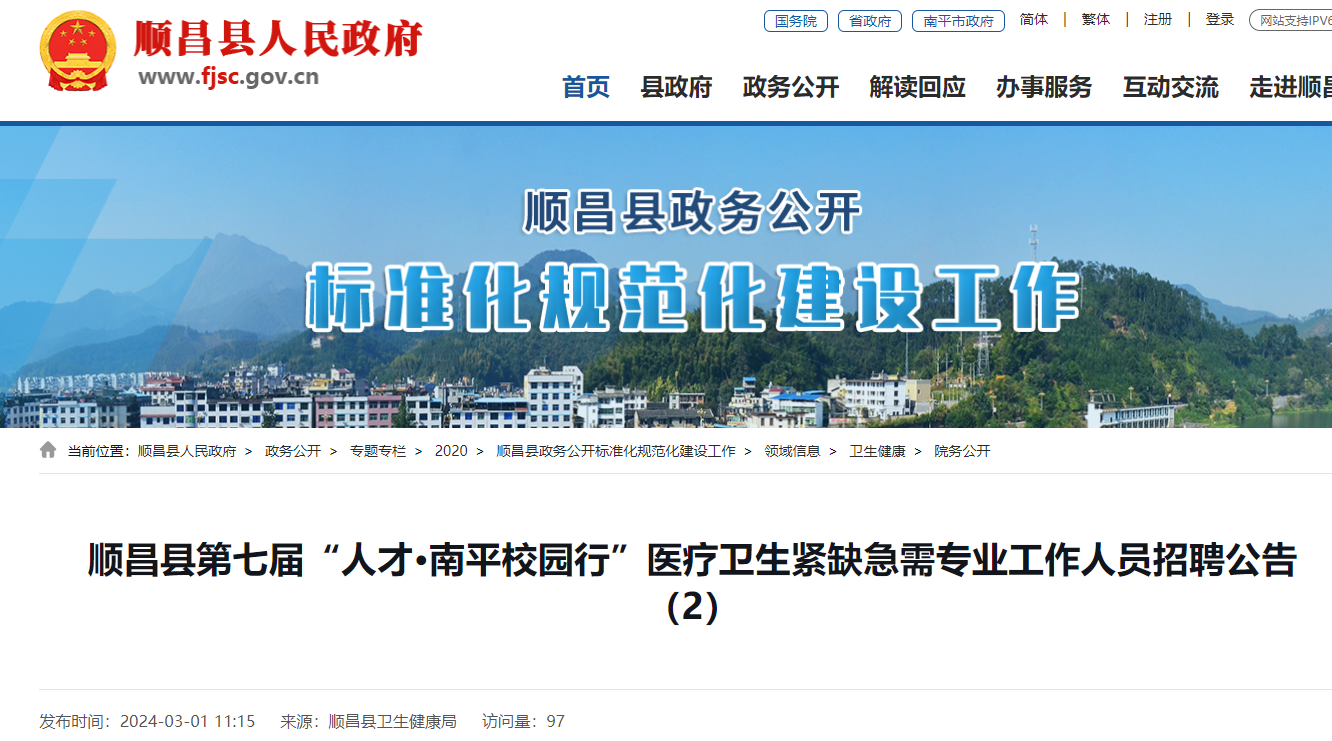 2024福建南平順昌縣第七屆“人才·南平校園行”醫(yī)療衛(wèi)生緊缺急需專業(yè)工作人員招聘公告已發(fā)布,報(bào)名時(shí)間:2024年3月9日(9:00-12:00)?,F(xiàn)將招聘公告原文發(fā)布如下: