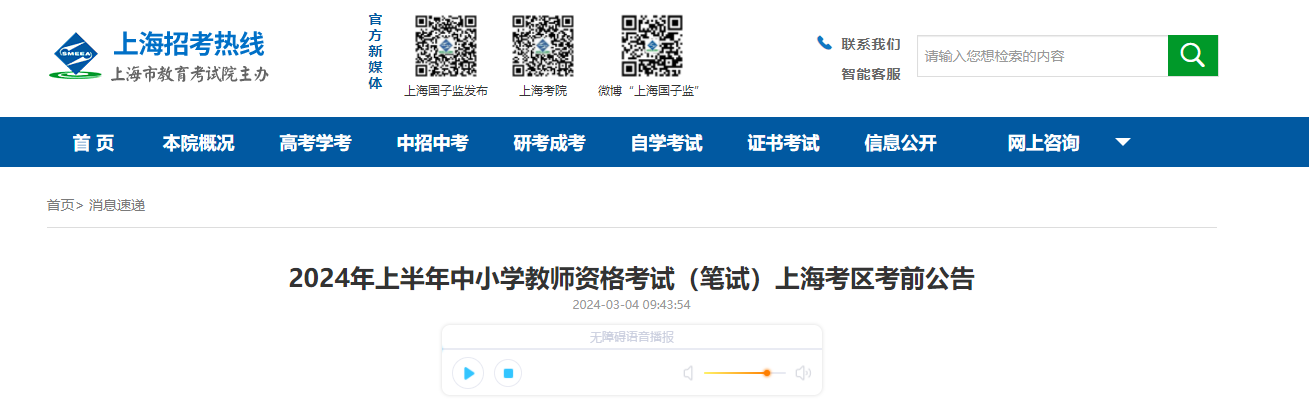 從上海市教育考試院獲悉,2024上半年上海中小學(xué)教師資格證考試時(shí)間及筆試考前公告已公布,3月9日舉行考試,具體詳情如下: