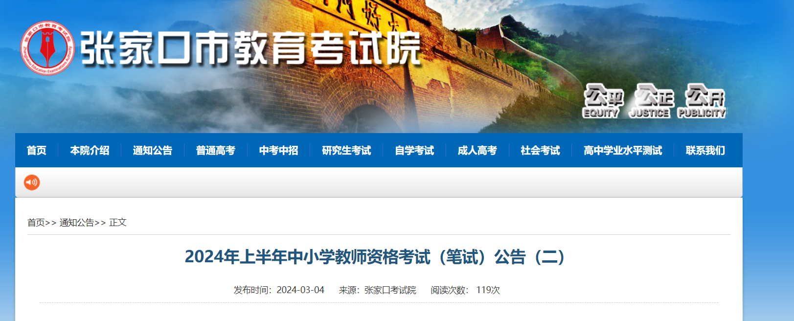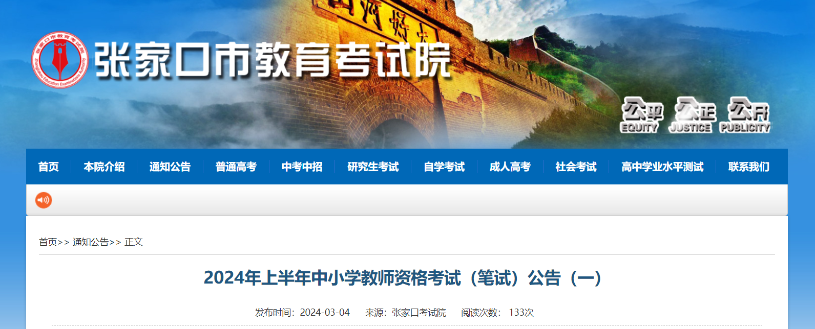 4.請仔細查看張家口市教育考試院發(fā)布的中小學教師資格考試(筆試)公告(一)。