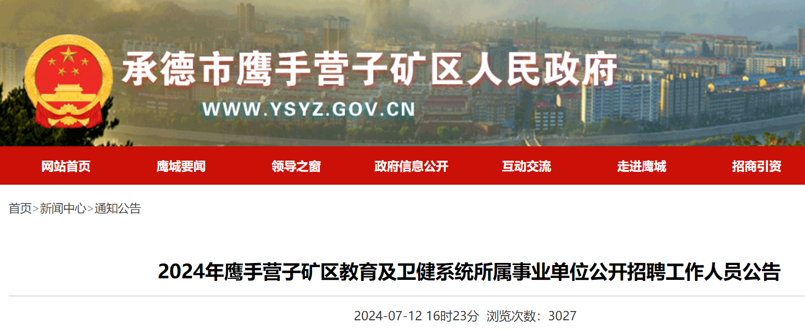 7.請(qǐng)考生務(wù)必關(guān)注鷹手營(yíng)子礦區(qū)人民政府門戶網(wǎng)站通知公告欄,此次招聘所有通知公告均通過該網(wǎng)站發(fā)布。如無(wú)特殊情況,不再電話通知。