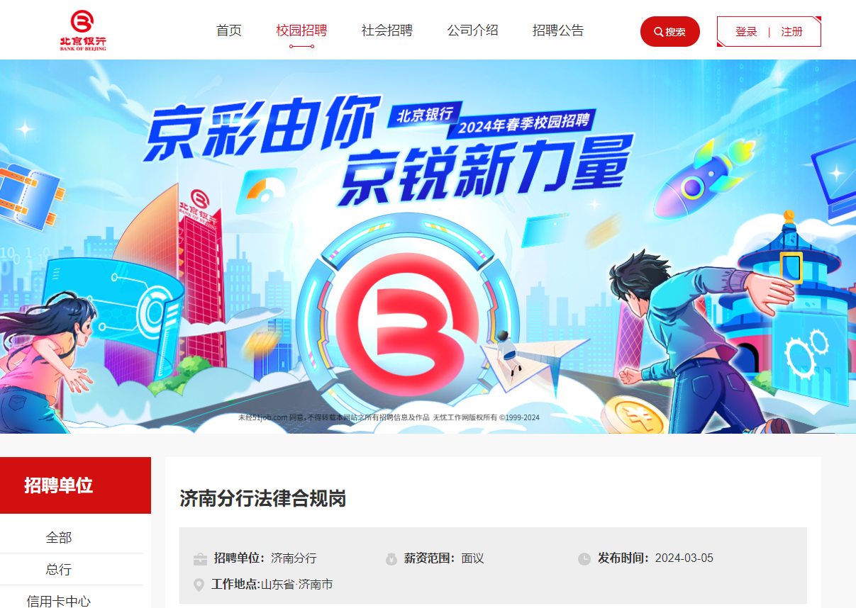 2024北京銀行山東濟南分行法律合規(guī)崗招聘公告已發(fā)布,報名截止日期:2024年3月31日?,F(xiàn)將招聘公告原文發(fā)布如下: