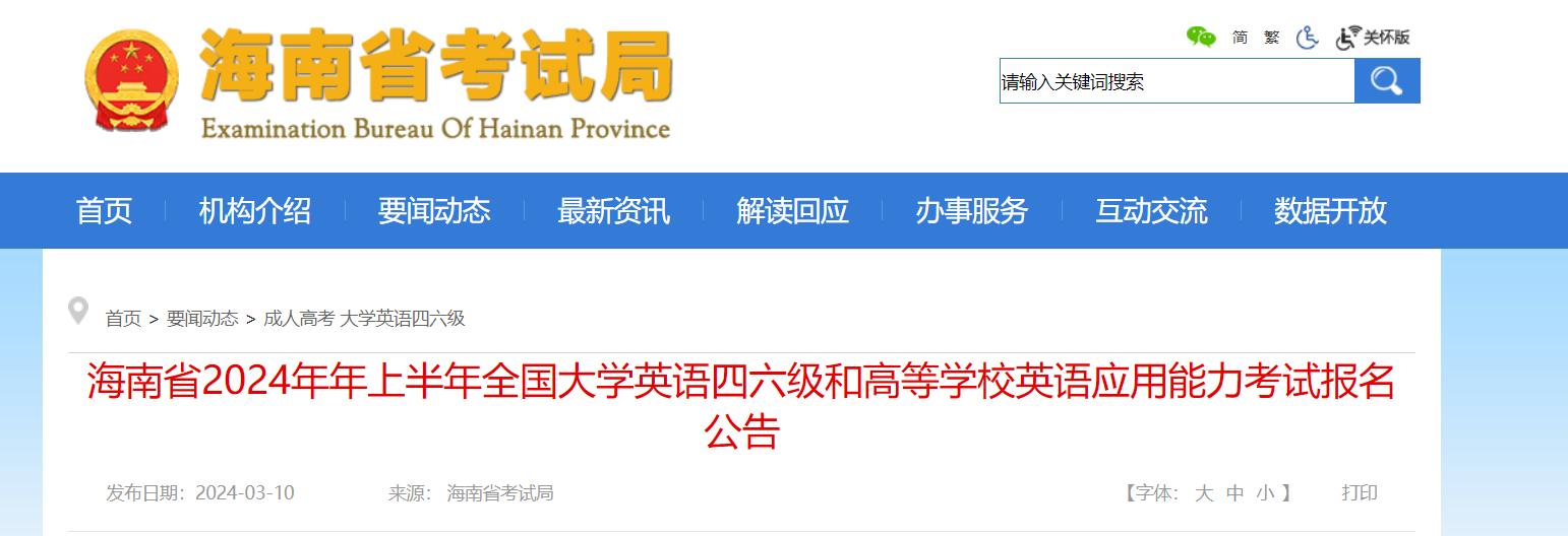 從海南省考試局獲悉,海南2024年上半年高等學校英語應用能力考試報名公告已公布,3月28日截止報考,具體詳情如下: