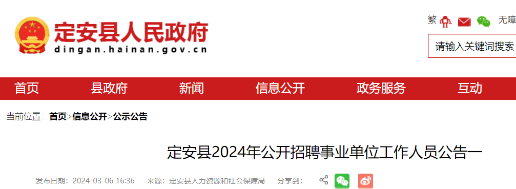 小編根據(jù)定安縣人民政府發(fā)布”定安縣2024年公開招聘事業(yè)單位工作人員公告一“得知,2024海南定安縣招聘事業(yè)單位工作人員報名時間2024年3月14日至3月20日。