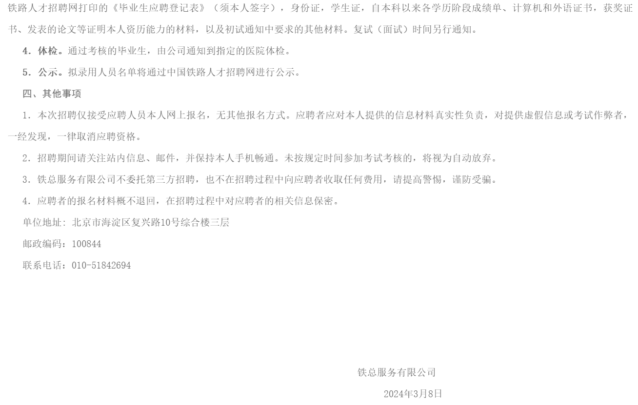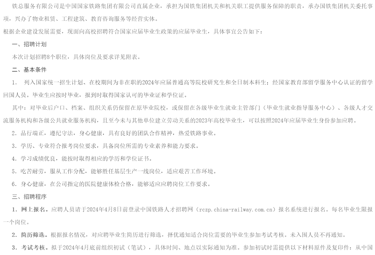 2024鐵總服務有限公司招聘應屆高校畢業(yè)生公告已發(fā)布,報名時間:4月8日前。現(xiàn)將招聘公告原文發(fā)布如下: