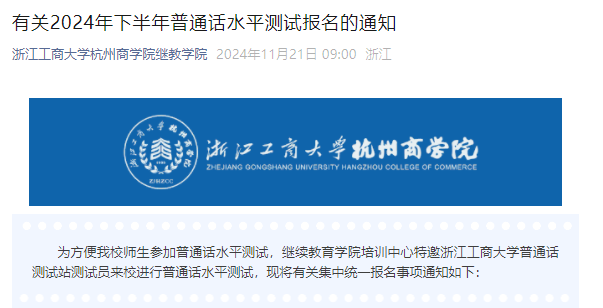 從浙江工商大學(xué)杭州商學(xué)院獲悉,浙江工商大學(xué)杭州商學(xué)院2024下半年普通話水平測(cè)試報(bào)名時(shí)間為11月22日起,考試時(shí)間為12月8日,具體詳情如下: