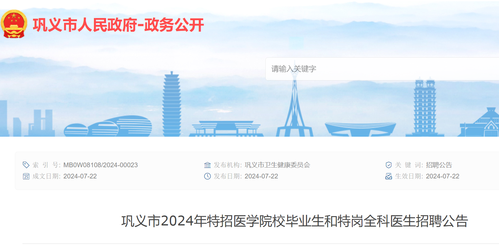 2024年河南鄭州鞏義市特招醫(yī)學(xué)院校畢業(yè)生和特崗全科醫(yī)生招聘公告已發(fā)布,報名時間:2024年8月5日至8月9日、8月12日至8月16日(上午:8:30—12:00,下午:14:30—18:00)?,F(xiàn)將招聘公告原文發(fā)布如下: