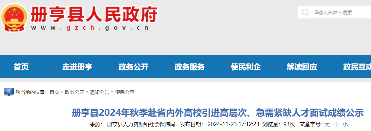 小編根據(jù)佛山市人力資源和社會(huì)保障局發(fā)布“冊(cè)亨縣2024年秋季赴省內(nèi)外高校引進(jìn)高層次、急需緊缺人才面試成績(jī)公示”得知,2024秋季貴州黔西南州冊(cè)亨縣赴省內(nèi)外高校引進(jìn)高層次、急需緊缺人才面試成績(jī)查詢?nèi)肟谝验_(kāi)通,詳情如下: