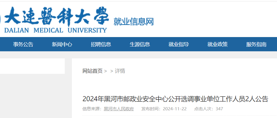 小編根據(jù)黑河市郵政業(yè)安全中心發(fā)布“2024年黑河市郵政業(yè)安全中心公開選調(diào)事業(yè)單位工作人員2人公告”得知,2024黑龍江黑河市郵政業(yè)安全中心選調(diào)事業(yè)單位工作人員2人,報(bào)名時(shí)間為11月25日-12月6日。