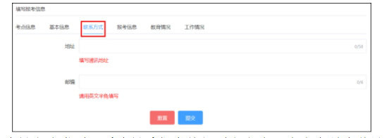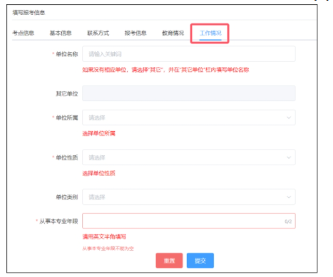 進入填寫報考信息頁面,系統(tǒng)將默認顯示上一年度的報名信息??忌氈痦摵藢拘畔?、聯(lián)系方式、報考信息、教育情況、工作情況,可根據(jù)本年度報名的實際情況修改,確認無誤后點擊提交。