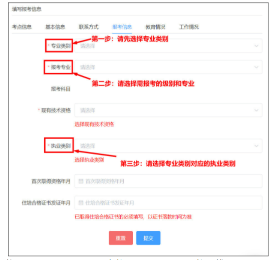 考生須根據(jù)所選的專業(yè)類別,勾選對應(yīng)的執(zhí)業(yè)類別,執(zhí)業(yè)類別不為“無”時,首次注冊年月不能為空。