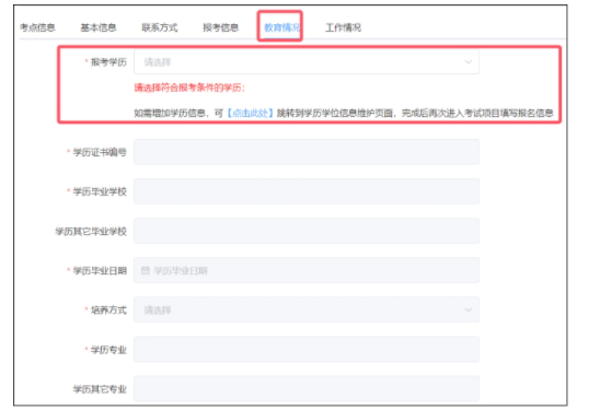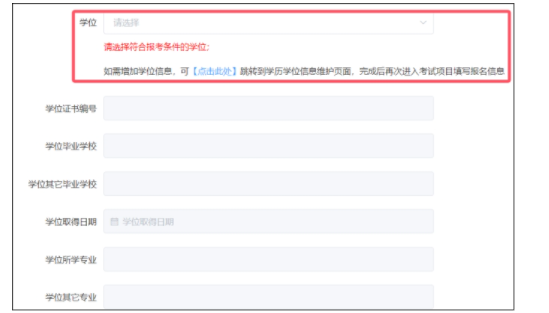 (5)報考學(xué)歷和學(xué)位相關(guān)信息下拉選擇,引用基本信息中【學(xué)歷學(xué)位信息維護】的內(nèi)容。如需修改,請在學(xué)歷學(xué)位信息維護頁面進行操作,完成后再次進入考試項目填寫報考信息,引用正確的學(xué)歷和學(xué)位信息。