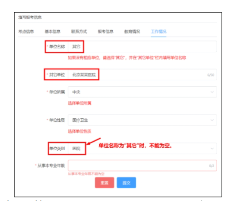 (6)填寫工作情況,包括“單位名稱”、“單位所屬”、“單位性質(zhì)”、“單位類別”和“從事本專業(yè)年限”。