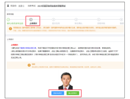 (7)以上信息提交后,系統(tǒng)會自動跳轉(zhuǎn)至上傳照片頁面,也可點擊【報考流程】中的“上傳照片”節(jié)點,進入功能區(qū)上傳照片。默認引用注冊照片,如無需修改,點擊“確認使用照片”;如需更換照片,下載照片審核處理工具對新照片處理后點擊“更換考試照片”,選擇處理后的新照片即可。