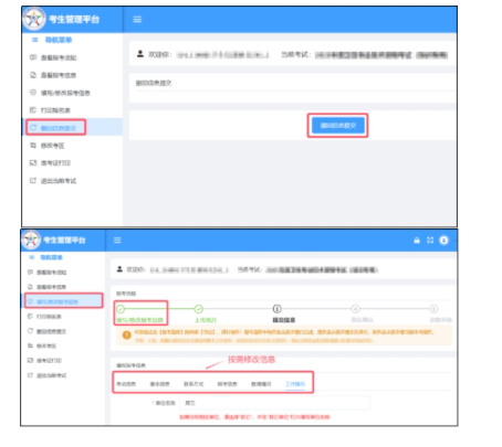 未進行報名確認的考生,可在報名確認結(jié)束前點擊“撤回信息提交”,通過【填寫/修改報考信息】功能修改相應(yīng)信息,修改完成后須再次提交并重新打印報名表。