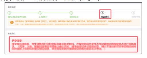 提交報名信息后,考生須按照當(dāng)?shù)乜荚嚬芾頇C構(gòu)的要求,在規(guī)定的時間內(nèi),攜帶報名表和相關(guān)材料前往指定地點進行報名確認。經(jīng)報名點或考點確認報名信息后,“報名確認”節(jié)點變?yōu)榫G色。