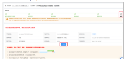 點擊報考流程中的【繳費】節(jié)點,核對報考專業(yè)科目和金額,確認無誤后,點擊“支付”按鈕跳轉(zhuǎn)至考區(qū)指定的繳費平臺進行支付。完成繳費后【繳費】節(jié)點變?yōu)榫G色,表示報名成功。
