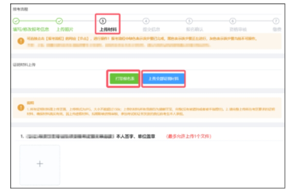 報考信息填寫完成后,系統(tǒng)將跳轉(zhuǎn)至【上傳材料】頁,考生也可點擊報考流程中的【上傳材料】節(jié)點進入上傳材料頁面??忌上赛c擊“打印報名表”,下載并打印報名申請表,然后按照考區(qū)的要求上傳相關(guān)證明材料。