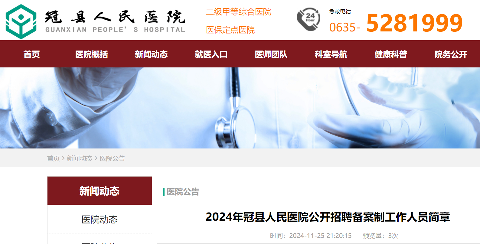2024年山東聊城冠縣人民醫(yī)院公開(kāi)招聘?jìng)浒钢乒ぷ魅藛T簡(jiǎn)章已發(fā)布,報(bào)名時(shí)間:2024年12月4日9:00-12月6日16:00?,F(xiàn)將招聘公告原文發(fā)布如下: