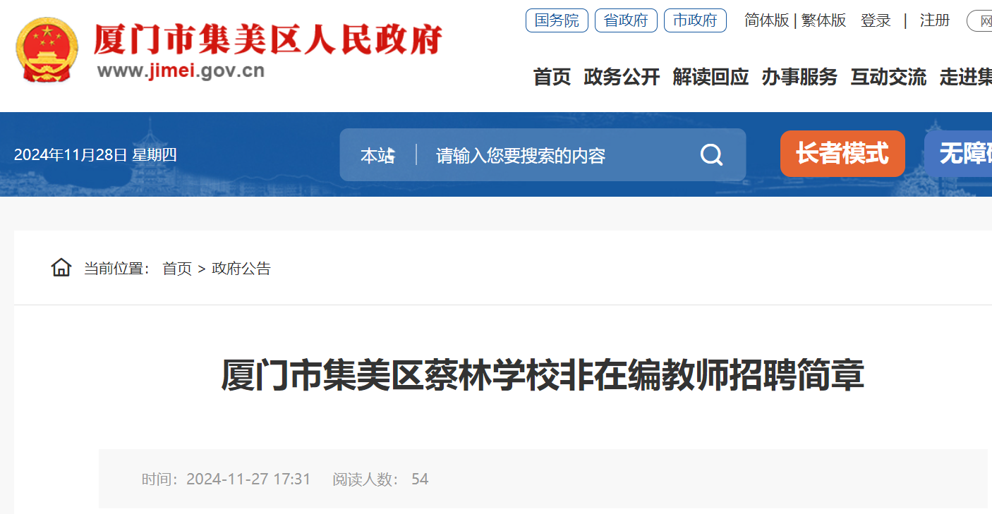 2024年福建廈門市集美區(qū)蔡林學(xué)校非在編教師招聘簡章已發(fā)布,報名時間:即日起至2024年12月11日。現(xiàn)將招聘公告原文發(fā)布如下: