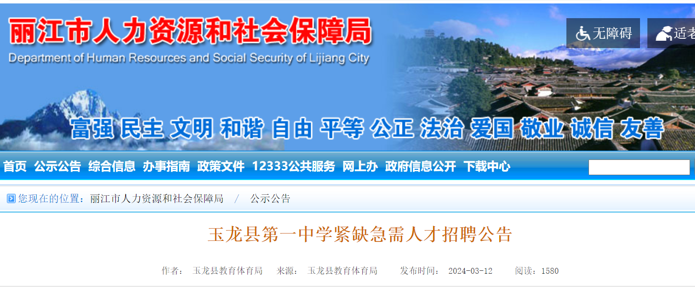 2024云南麗江玉龍縣第一中學(xué)緊缺急需人才招聘公告已發(fā)布,現(xiàn)將招聘公告原文發(fā)布如下: