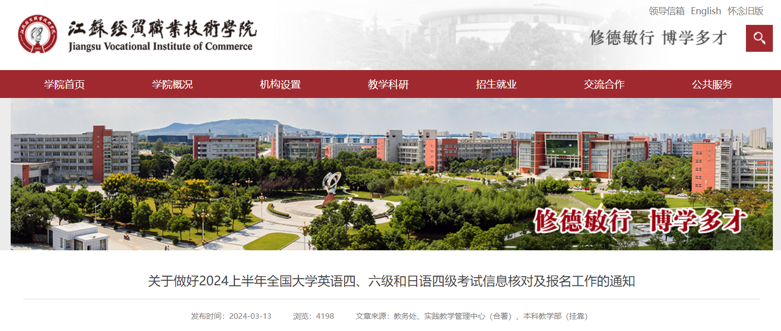 從江蘇經(jīng)貿(mào)職業(yè)技術(shù)學(xué)院獲悉,江蘇經(jīng)貿(mào)職業(yè)技術(shù)學(xué)院2024上半年英語(yǔ)四六級(jí)考試報(bào)名通知已公布,3月19日12:00后報(bào)考,具體詳情如下:
