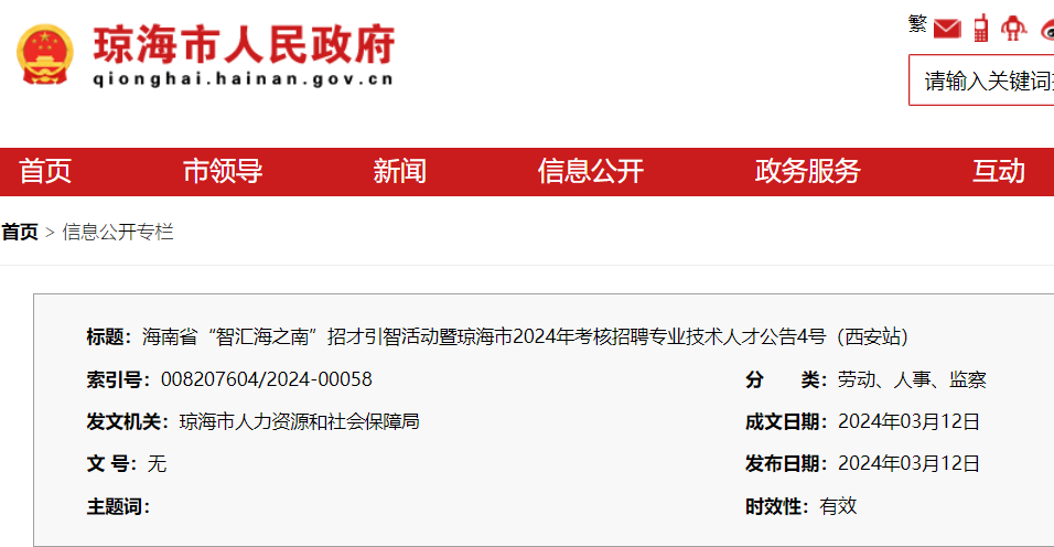 小編根據(jù)瓊海市人民政府網(wǎng)發(fā)布”2024年考核招聘專業(yè)技術人才公告4號(西安站)“得知,2024海南省智匯海之南招才引智活動暨瓊海市考核招聘專業(yè)技術人才46人。
