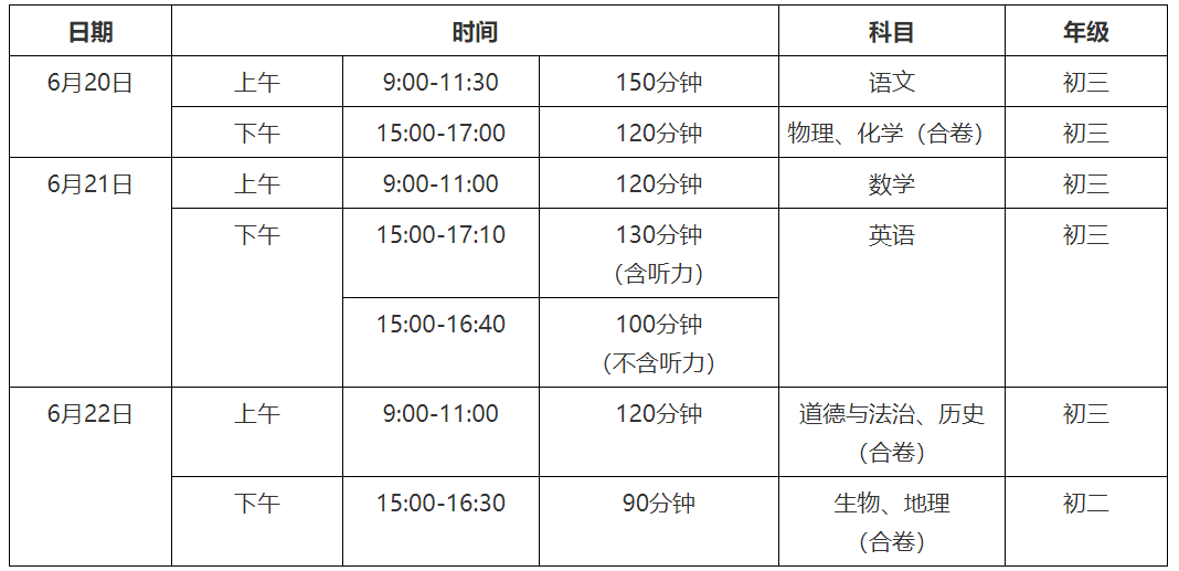 初三年級(jí):語(yǔ)文、數(shù)學(xué)、英語(yǔ)(含聽(tīng)力或聽(tīng)說(shuō))實(shí)行分卷考試,卷面分值每科各120分;道德與法治和歷史實(shí)行合卷考試,卷面分值道德與法治60分、歷史60分;物理和化學(xué)實(shí)行合卷考試,卷面分值物理70分、化學(xué)50分。