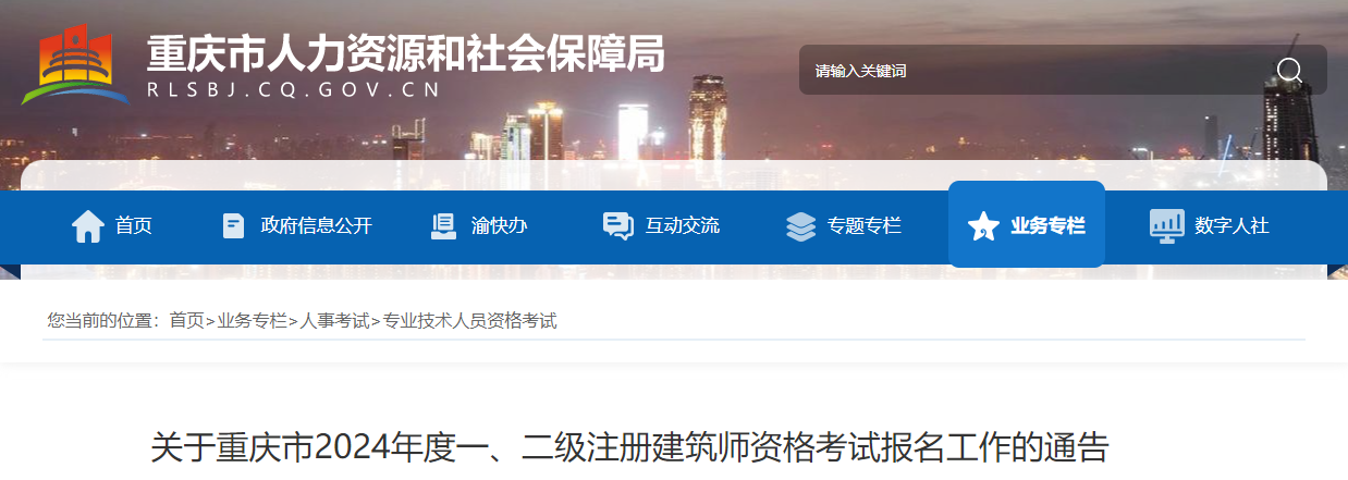 根據(jù)人力資源和社會(huì)保障部人事考試中心《關(guān)于2024年度全國(guó)一、二級(jí)注冊(cè)建筑師資格考試考務(wù)工作的通知》(人考中心函〔2024〕7號(hào))精神和重慶市人事考試中心、重慶市注冊(cè)建筑師管理委員會(huì)《關(guān)于做好重慶市2024年度一、二級(jí)注冊(cè)建筑師資格考試考務(wù)工作的通知》(渝人考〔2024〕6號(hào))要求,為方便廣大考生報(bào)考,現(xiàn)將有關(guān)事項(xiàng)通告如下:
