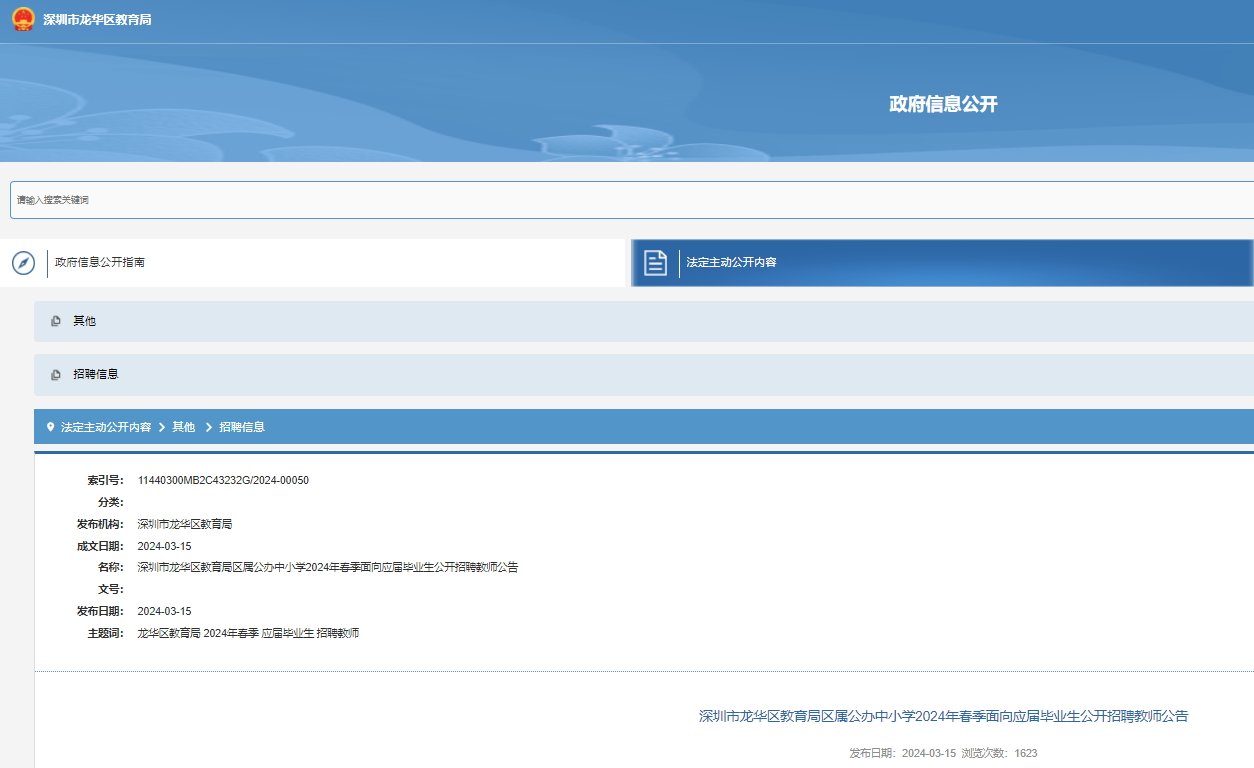 2024年春季廣東深圳市龍華區(qū)教育局區(qū)屬公辦中小學(xué)面向應(yīng)屆畢業(yè)生公開招聘教師公告已發(fā)布,北京、廣州考點(diǎn)報(bào)名截止時(shí)間為3月27日18:00;武漢、哈爾濱考點(diǎn)報(bào)名截止時(shí)間為4月10日18:00?,F(xiàn)將招聘公告原文發(fā)布如下: