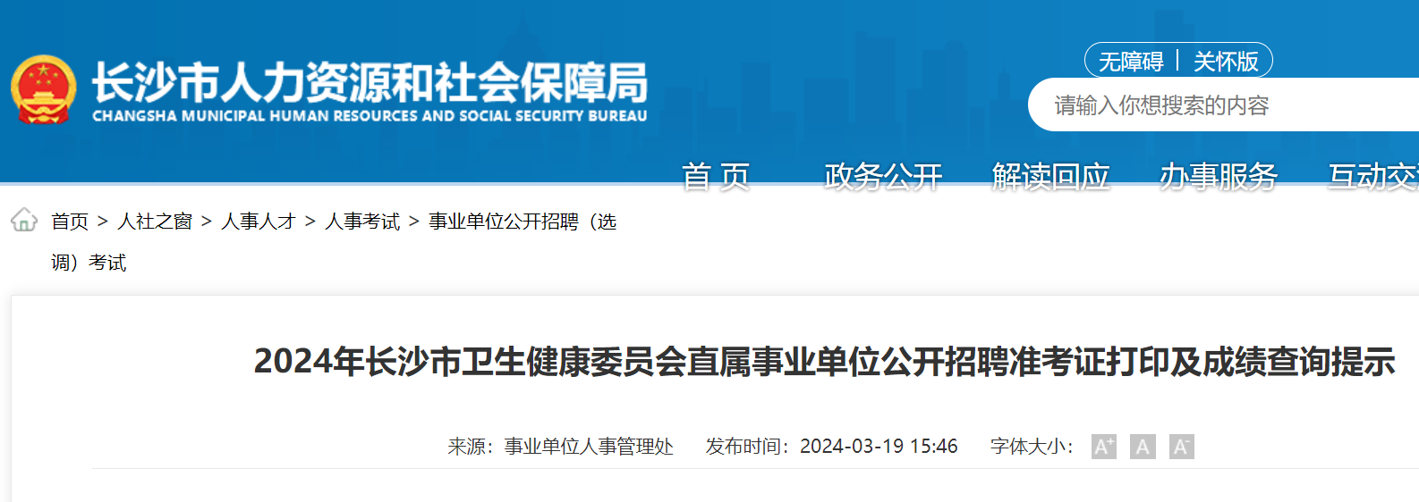 各位考生:現(xiàn)將2024年長(zhǎng)沙市衛(wèi)生健康委員會(huì)直屬事業(yè)單位公開招聘筆試準(zhǔn)考證打印及筆試成績(jī)查詢網(wǎng)址進(jìn)行調(diào)整,有關(guān)提示如下:
