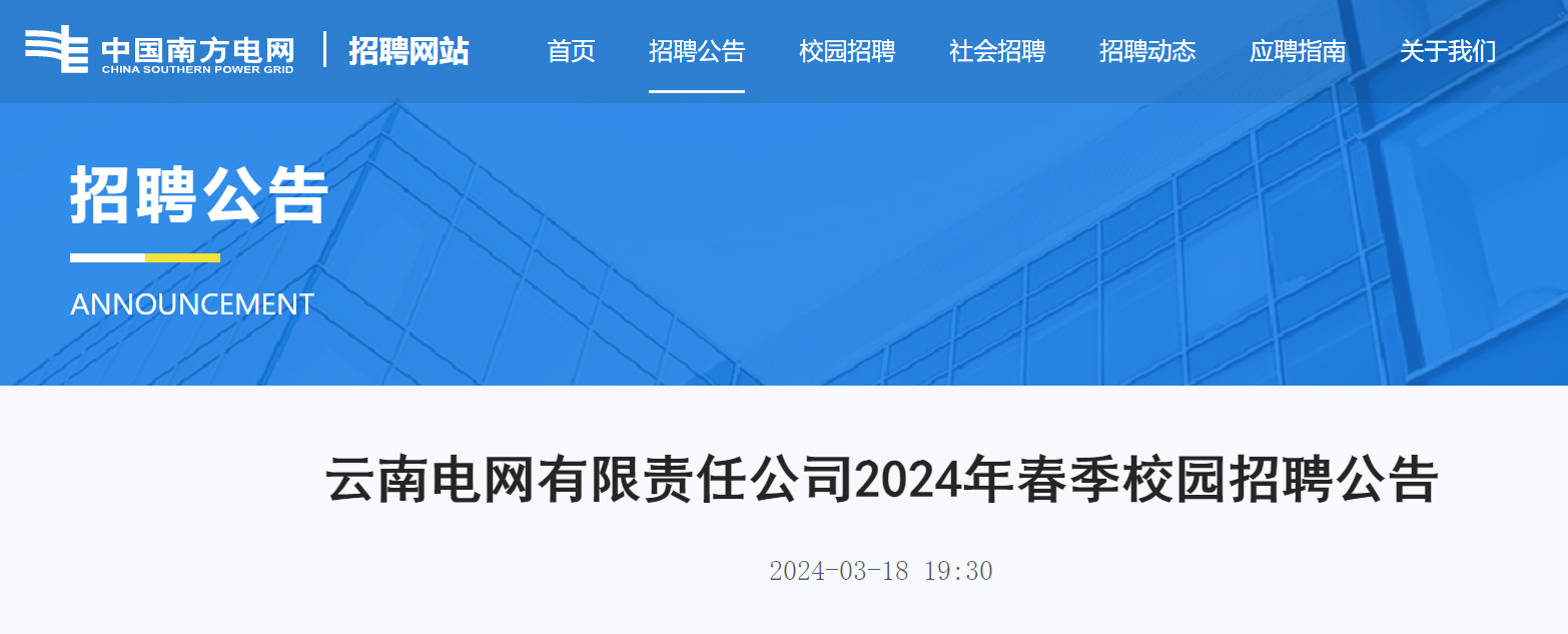 2024年春季中國(guó)南方電網(wǎng)云南電網(wǎng)有限責(zé)任公司校園招聘公告已發(fā)布,報(bào)名時(shí)間:公告發(fā)布之日起至2024年3月27日,現(xiàn)將招聘公告原文發(fā)布如下: