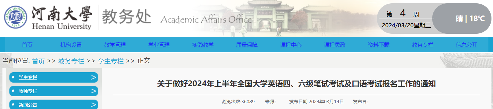 從河南大學教務處獲悉,河南大學2024上半年英語四六級筆試考試及口語考試報名通知已公布,3月21日-27日進行報考,具體詳情如下: