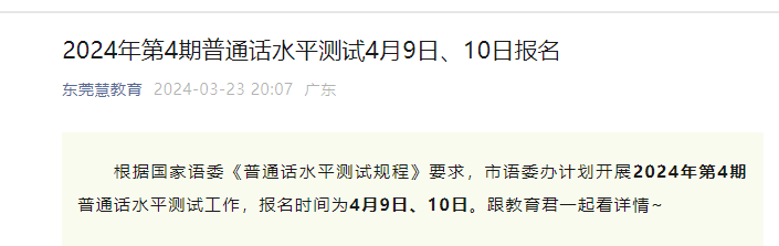 根據(jù)國家語委《普通話水平測試規(guī)程》要求,市語委辦計劃開展2024年第4期普通話水平測試工作,報名時間為4月9日、10日。跟教育君一起看詳情~