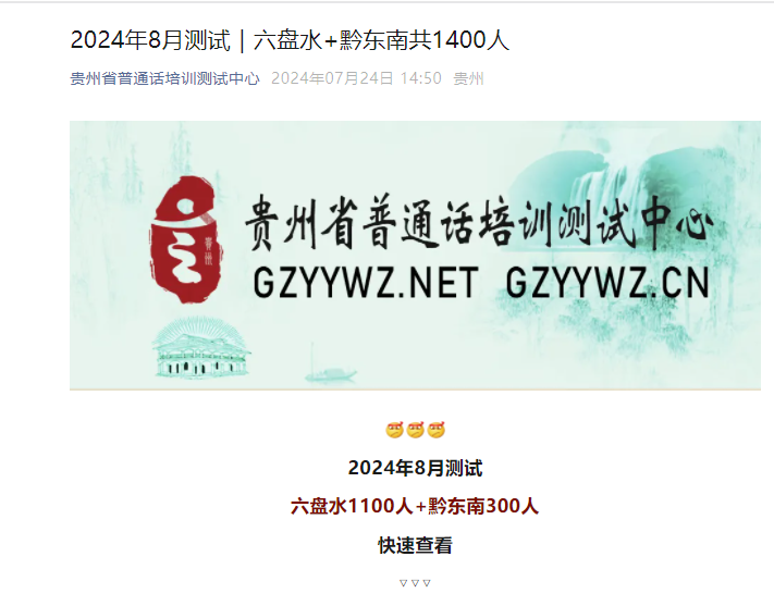從貴州省普通話培訓測試中心獲悉,2024年8月貴州六盤水+黔東南普通話考試時間及報名時間安排(共1400人)已公布,具體詳情如下: