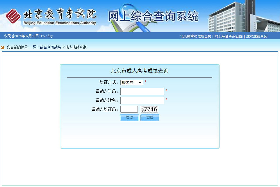 考生可通過北京教育考試院(https://www.bjeea.cn/)、成考成招頻道(https://www.bjeea.cn/html/ckcz/index.html)進入成績查詢系統(tǒng)(http://query.bjeea.cn/queryService/rest/score/104)選擇驗證方式、輸入號碼、姓名、驗證碼、點擊查詢即可獲取成績信息。