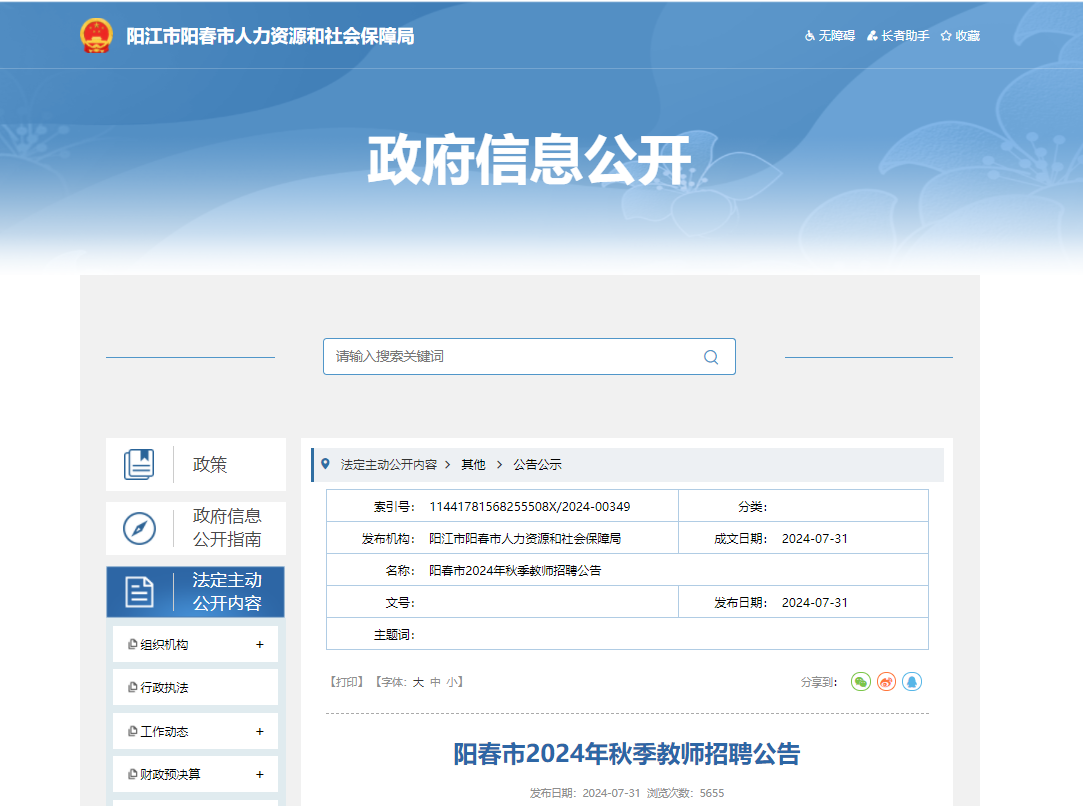 2024年秋季廣東陽江陽春市教師招聘公告已發(fā)布,網(wǎng)上報名時間:2024年8月5日8:30至8月10日17:30?,F(xiàn)將招聘公告原文發(fā)布如下: