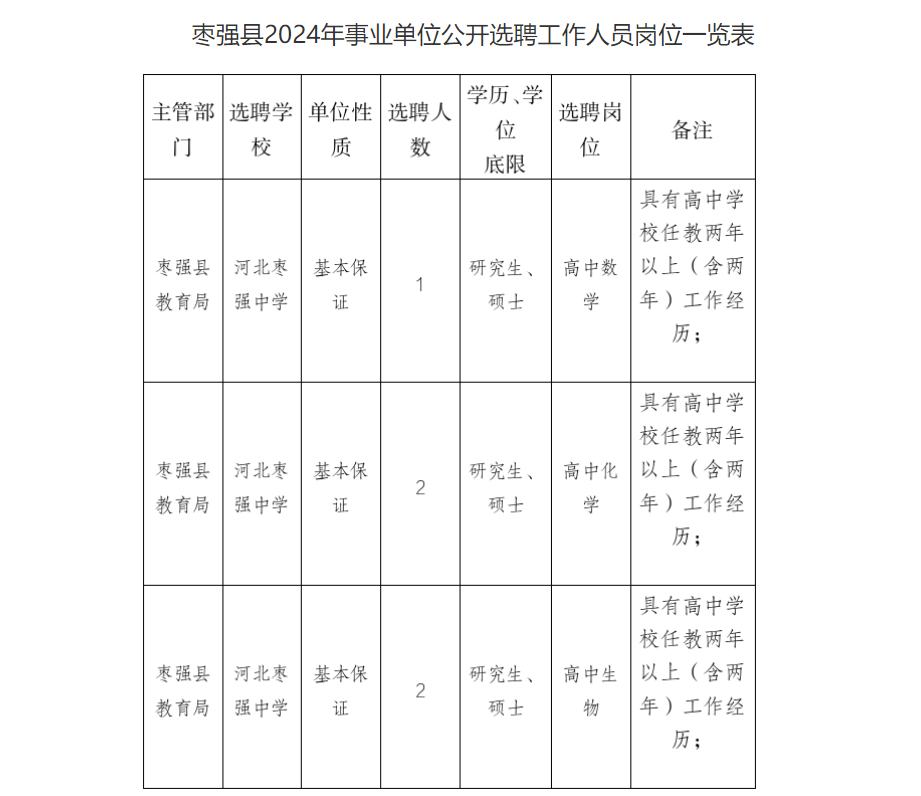 具體事業(yè)單位崗位及要求詳見《棗強縣2024年事業(yè)單位公開選聘工作人員崗位一覽表》。