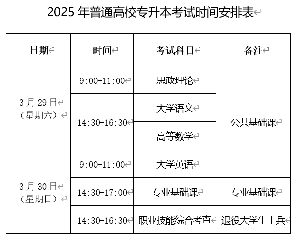 1.普通考生(含選擇本類型的獲獎考生)和脫貧戶家庭考生(含選擇本類型的獲獎考生)的考試安排在2025年3月29日至30日進行??荚嚳颇糠譃楣不A(chǔ)課和專業(yè)基礎(chǔ)課,總分600分。公共基礎(chǔ)課3門,每門滿分100分,每門考試時長120分鐘,專業(yè)基礎(chǔ)課1門,滿分300分,考試時長150分鐘。