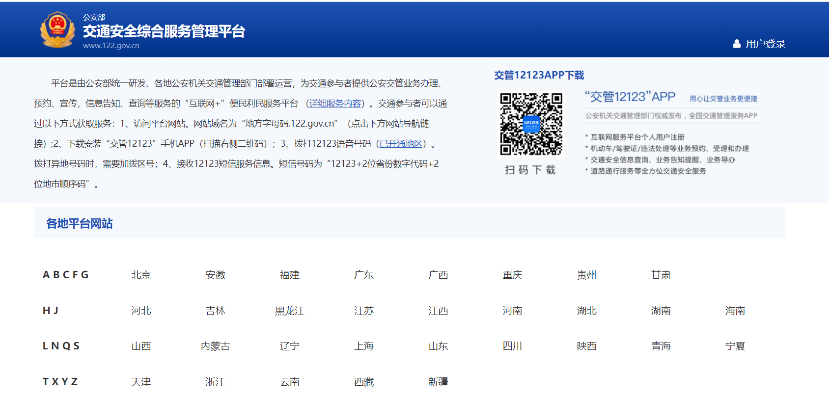 1.打開(kāi)交通安全綜合服務(wù)管理平臺(tái)打開(kāi)交通安全綜合服務(wù)管理平臺(tái),網(wǎng)址:www.122.gov.cn,選擇您所在的省市(選擇:云南)。