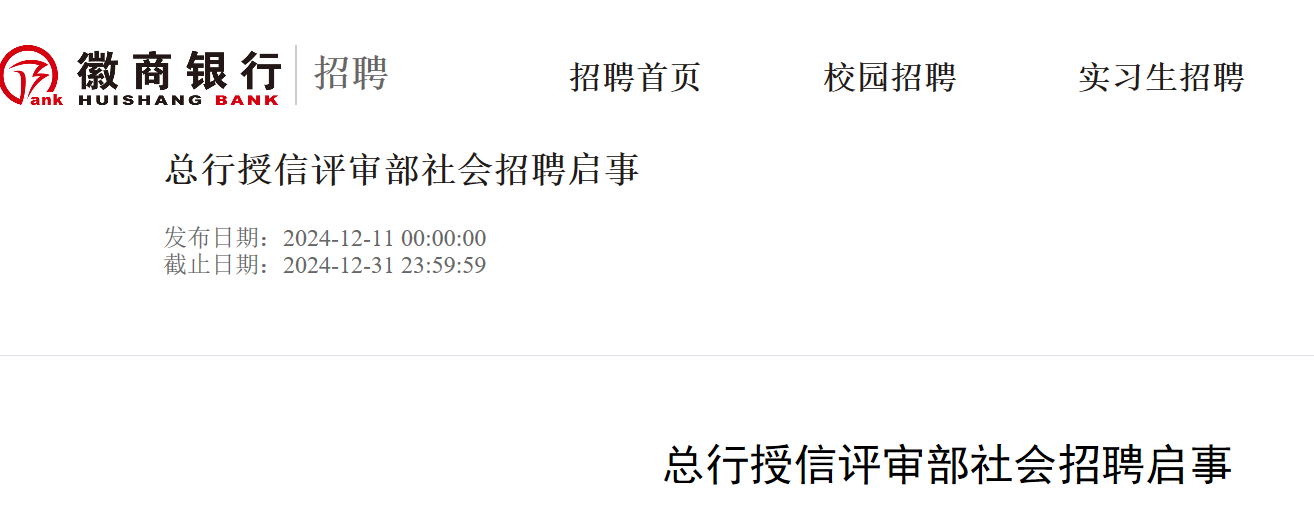 2024年徽商銀行總行授信評審部社會招聘啟事已發(fā)布,現(xiàn)將招聘公告原文發(fā)布如下: