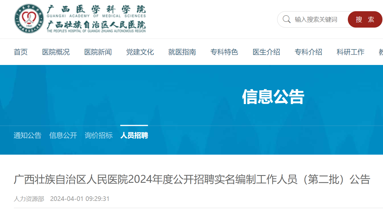體檢合格擬聘人員將在廣西人才網(wǎng)(www.gxrc.com)、廣西壯族自治區(qū)衛(wèi)生健康委員會(huì)網(wǎng)站(http://wsjkw.gxzf.gov.cn/)、廣西壯族自治區(qū)人民醫(yī)院網(wǎng)站(192.168.101.98:88)公示,公示期7個(gè)工作日。