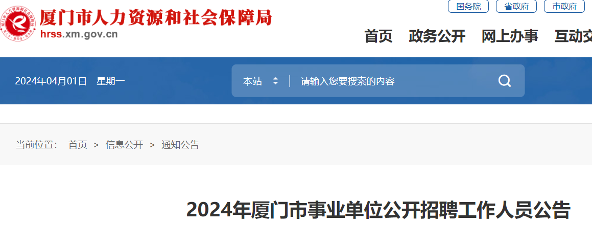 根據事業(yè)單位公開招聘有關規(guī)定,結合我市事業(yè)單位工作需要,市、區(qū)組織人社部門決定組織實施2024年廈門市部分事業(yè)單位公開招聘工作人員的工作?,F將有關事項公告如下: