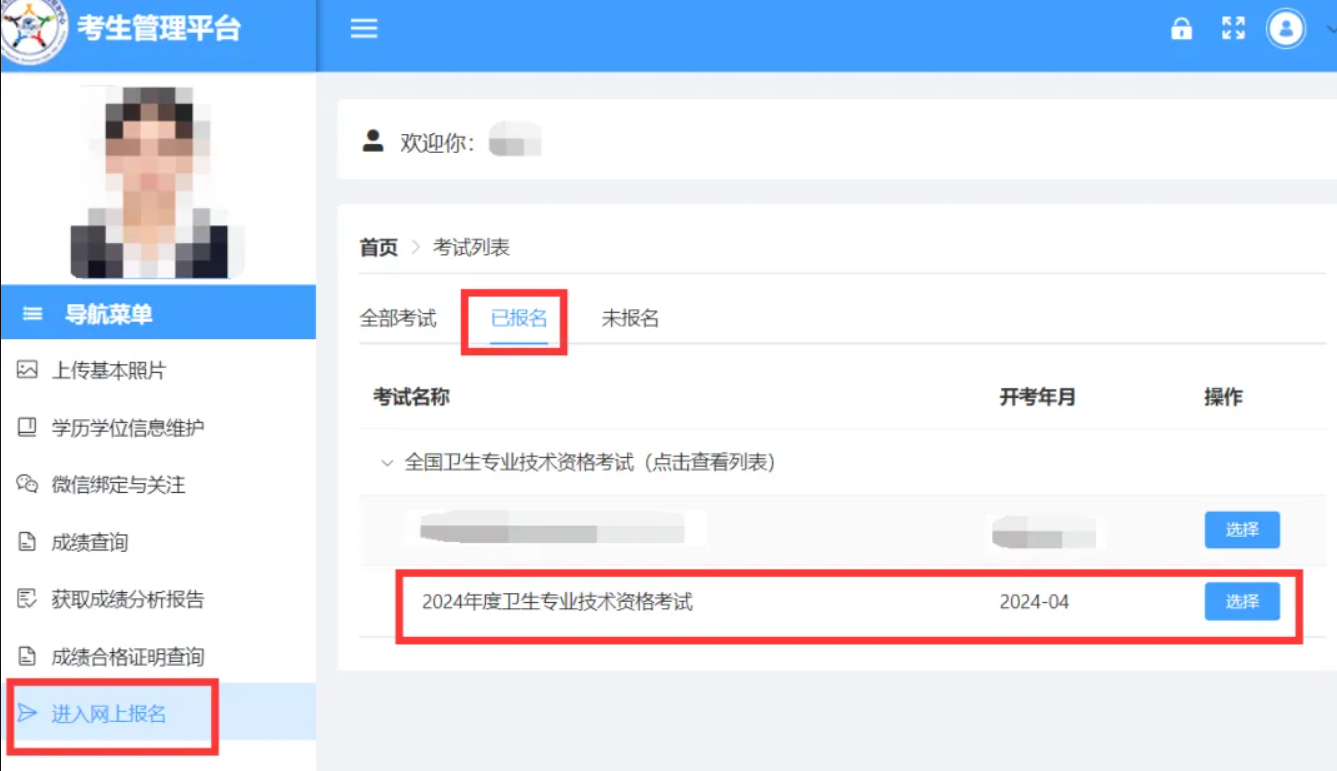 登錄考生管理平臺后,點擊左側(cè)導(dǎo)航欄“進(jìn)入網(wǎng)上報名”,在“已報名”考試列表中選擇考試項目。