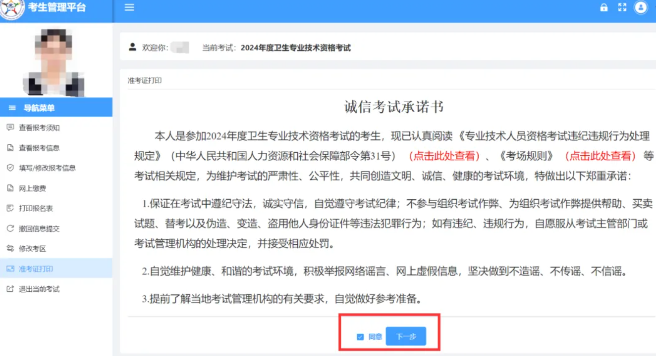 認(rèn)真閱讀《誠信考試承諾書》,勾選“同意”,點擊“下一步”。