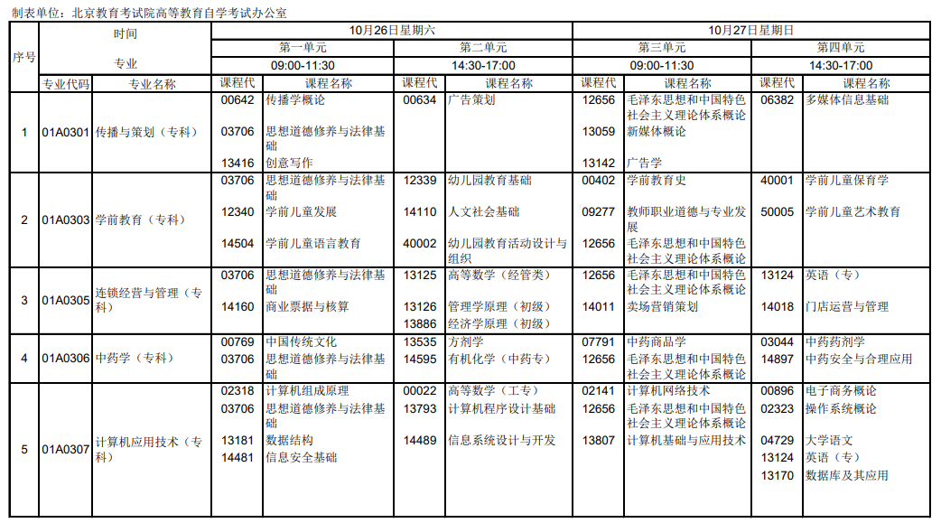 北京市高等教育自學(xué)考試2024年下半年筆試課程考試安排